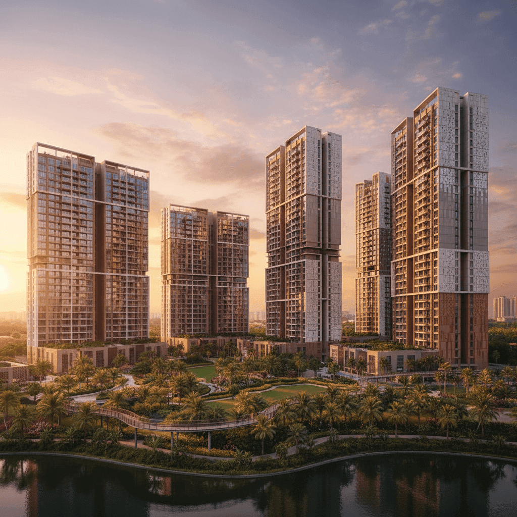A high-rise community across 25.90 Acres, with 7 Towers (G+32 to G+39) in Phase 1. It is an IGBC Platinum pre-certified development, emphasizing sustainability and 8 Acres of Central Greens.